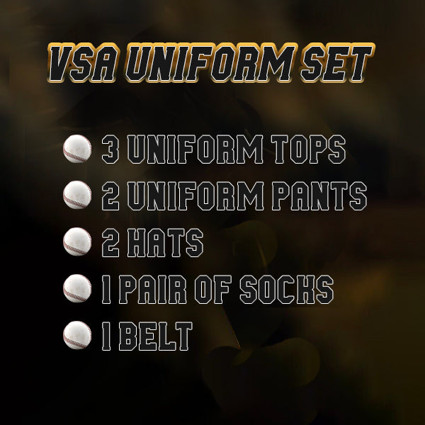 This VSA Uniform Set includes 3 tops, 2 pants, 2 hats, 1 pair of socks, and 1 belt. Made with high-quality materials, this set ensures comfort and durability for long-term wear. Perfect for any uniformed occasion, this set provides a professional and polished look.